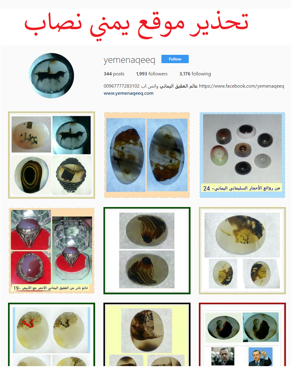 انتبه هذا الشخص يدعي انه مسلم ويخاف الله ويتلحف برداء الدين وهو حرامي معروف في اليمن فقد حولناله مبلغ لشراء عقيق يمني وبعد التحويل عشرين يوم كل يوم يتحجج بحجه جديده وبعدما قلنا له نريد الغاء الطلب ونريد اموالنا اظهر وجهه الحقيقي وعرفنا من الاخوان ان هذا نصاب عايش بصنعاء على النصب والاحتيال اكله كله حرام بحرام فتحت هذا الموقع حتى اجنبكم من التعامل معاه لعل شخص محتاج المبلغ اللي بيرسله لهذا الحرامي ويقوم بسرقته.